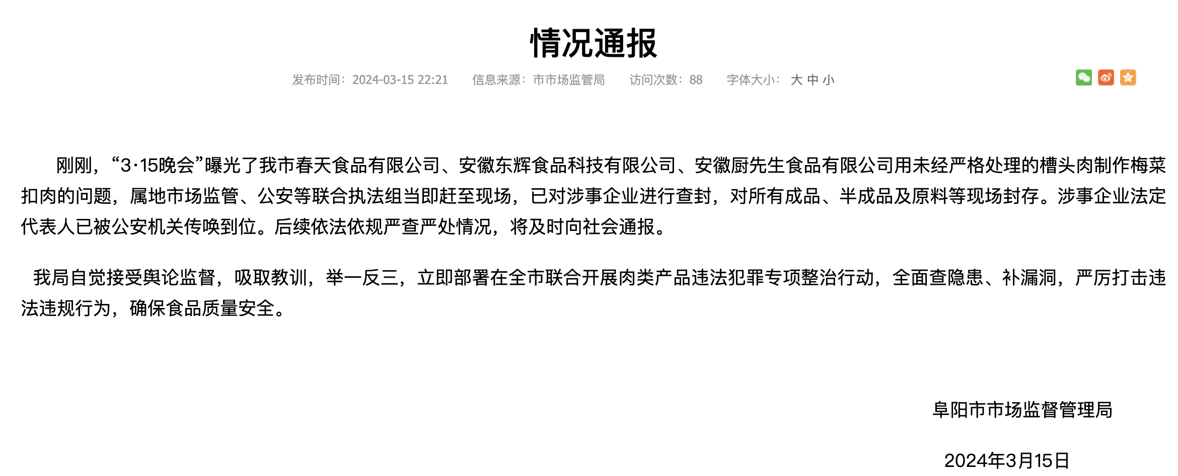 3月15日晚, 阜阳市市场监督管理局发布情况通报:刚刚,“3·15晚会”曝光了我市春天食品有限公司、安徽东辉食品科技有限公司、安徽厨先生食品有限公司用未经严格处理的槽头肉制作梅菜扣肉的问题,属地市场监管、公安等联合执法组当即赶至现场,已对涉事企业进行查封,对所有成品、半成品及原料等现场封存。涉事企业法定代表人已被公安机关传唤到位。后续依法依规严查严处情况,将及时向社会通报。