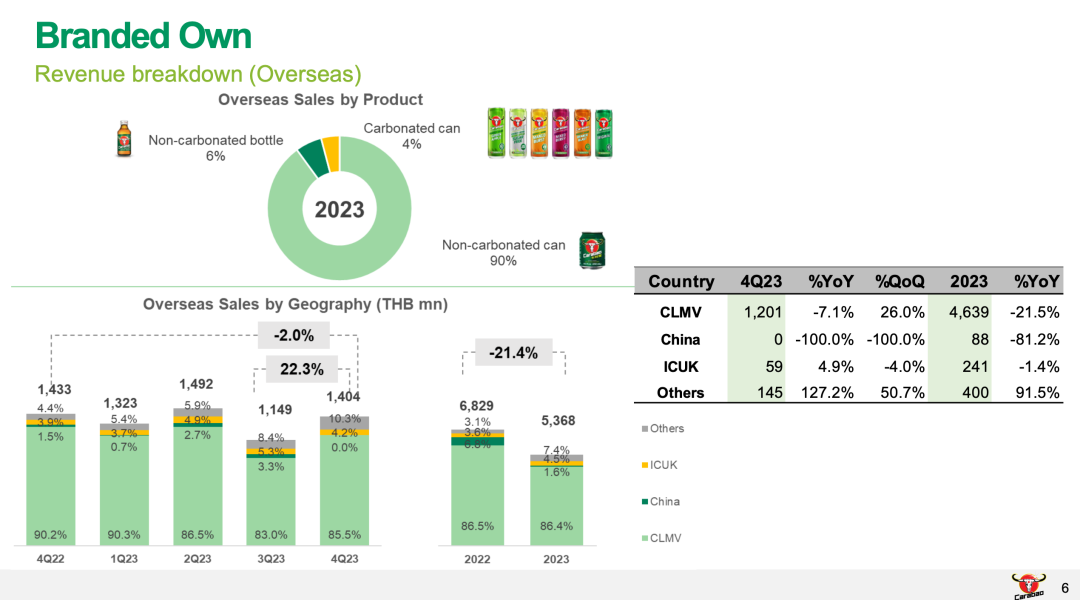 首先,是中国市场的最新业绩。2023年,卡拉宝中国收入为8800万泰铢(折合人民币约1770万元),同比下降81.2%。其中,在去年第四季度,中国分部记录的收入为“0”,或同比下降100%。从中国业务收入贡献看,2022年时占集团整体收入的6.8%,2023年下降至1.6%。