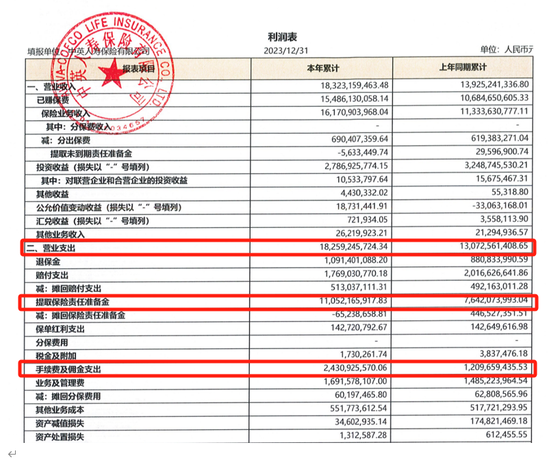其中,2023年中英人寿提取保险责任准备金110.52亿元,同比大增44.62%。手续费及佣金支出为24.31亿元,较2022年同比增长100.91%。