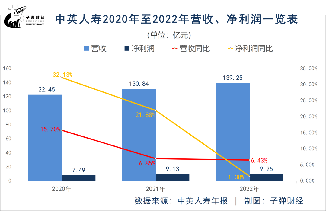 近几年来,中英人寿的营业收入增速连续下滑。近三年年报数据显示,2020年至2022年,中英人寿的营业收入依次为122.45亿元、130.84亿元、139.25亿元,同期增长速度分别为15.70%、6.85%、6.43%。