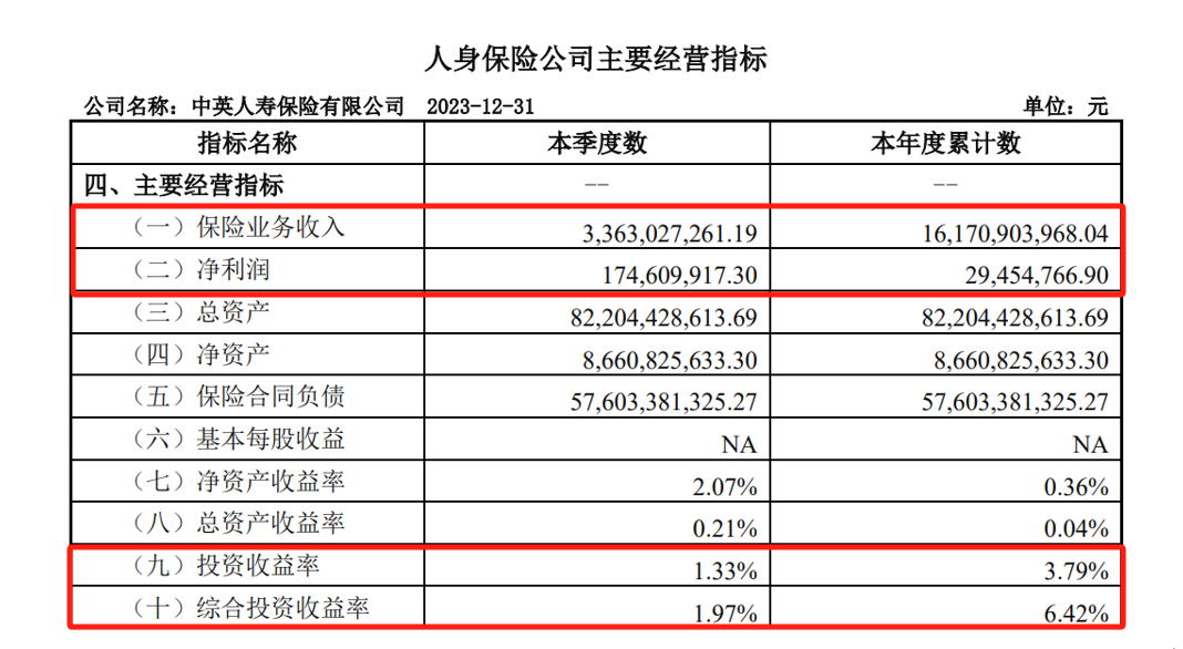 中英人寿2023年第四季度偿付能力报告显示,中英人寿第四季度实现保险业务收入33.63亿元,同比增长29.5%,全年度累计实现保险业务收入161.71亿元,同比增长42.68%。