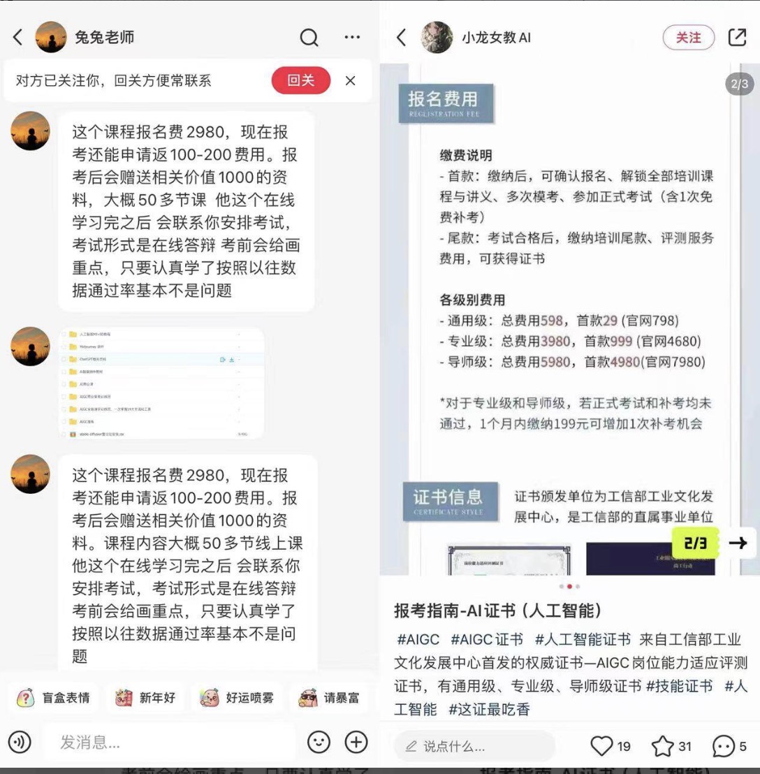 “花2980元,学习50节线上课,便能获得一张认证的AIGC证书”、“花598元,上4小时课,能获得认证的AIGC证书。”