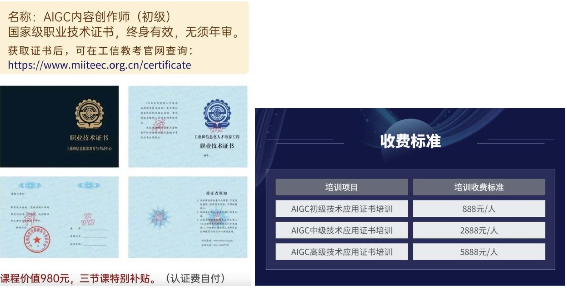 与“李一舟们”类似的,还有另一种AI培训的商业模式,那便是AIGC培训证书。
