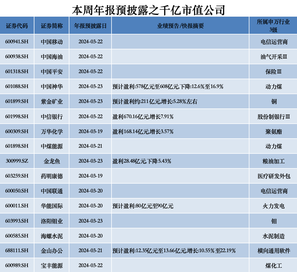 本周,有16家千亿市值的上市公司披露年报,有7家已提前披露了业绩预告或快报。