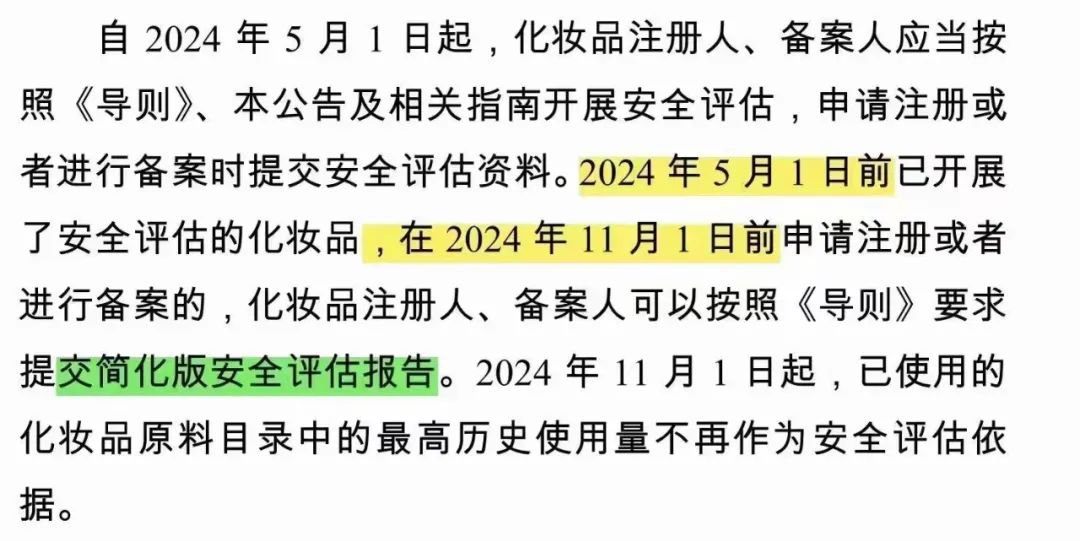 文件称,“2024年5月1日前已开展了安全评估的化妆品,在2024年11月1日前申请注册或者进行备案的,化妆品注册人、备案人可以按照《导则》要求提交简化版安全评估报告”。这意味着,难住了整个行业的完整版“安评”,将有望延期半年实施。
