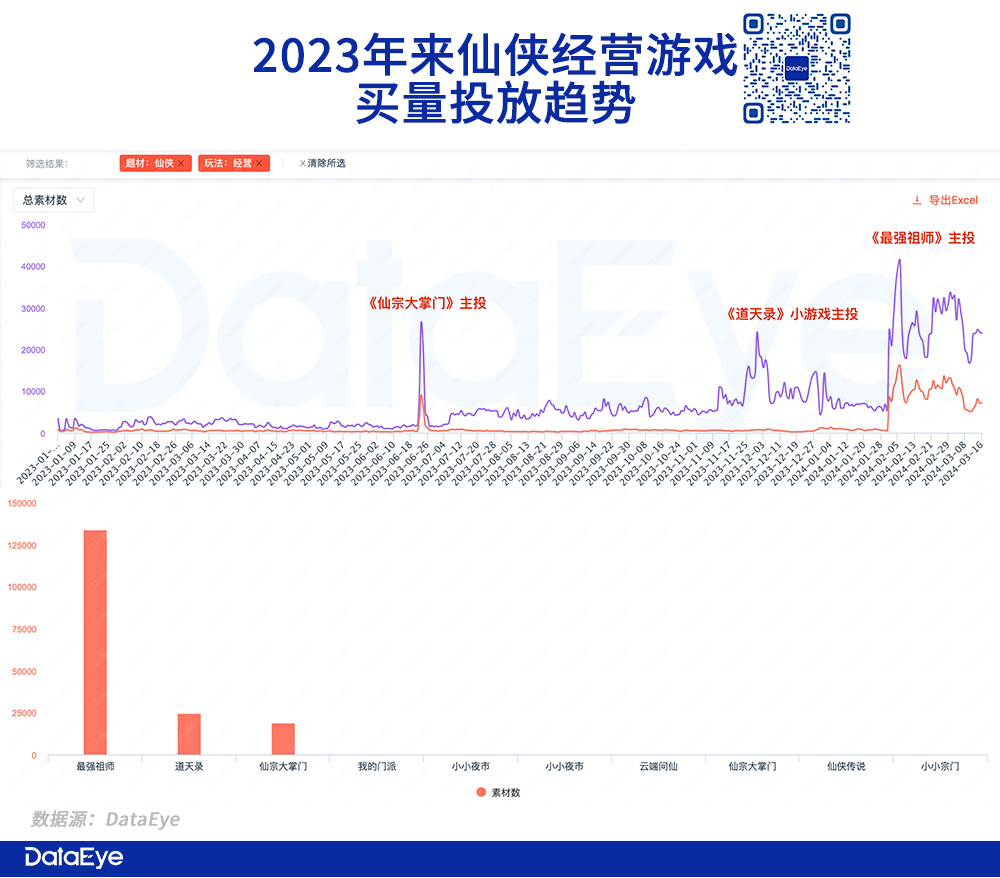 从细分赛道来看,修仙/仙侠+模拟经营,相对空白,ADX数据显示:仙侠题材、经营玩法的在投游戏,主要是《最强祖师》、《道天录》、《仙宗大掌门》。在此前《道天录》投出一片天、铺好路之后,《最强祖师》确实承接了被“教育好”的市场流量。这种“前人栽树、后人乘凉”的现象,我们在其它玩法like小游戏(如开箱子、塔防割草)也屡见不鲜。