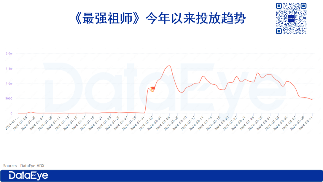 DataEye-ADX数据显示,《最强祖师》在今年1月份开始进行素材投放。但日均投放素材并不突出,上线之前素材投放量日均在一百组左右。直到游戏上线前一天,素材投放量才迎来提升,单日素材视频+图片8315。之后几天,投放持续飙升,2月6日最高达到15943!