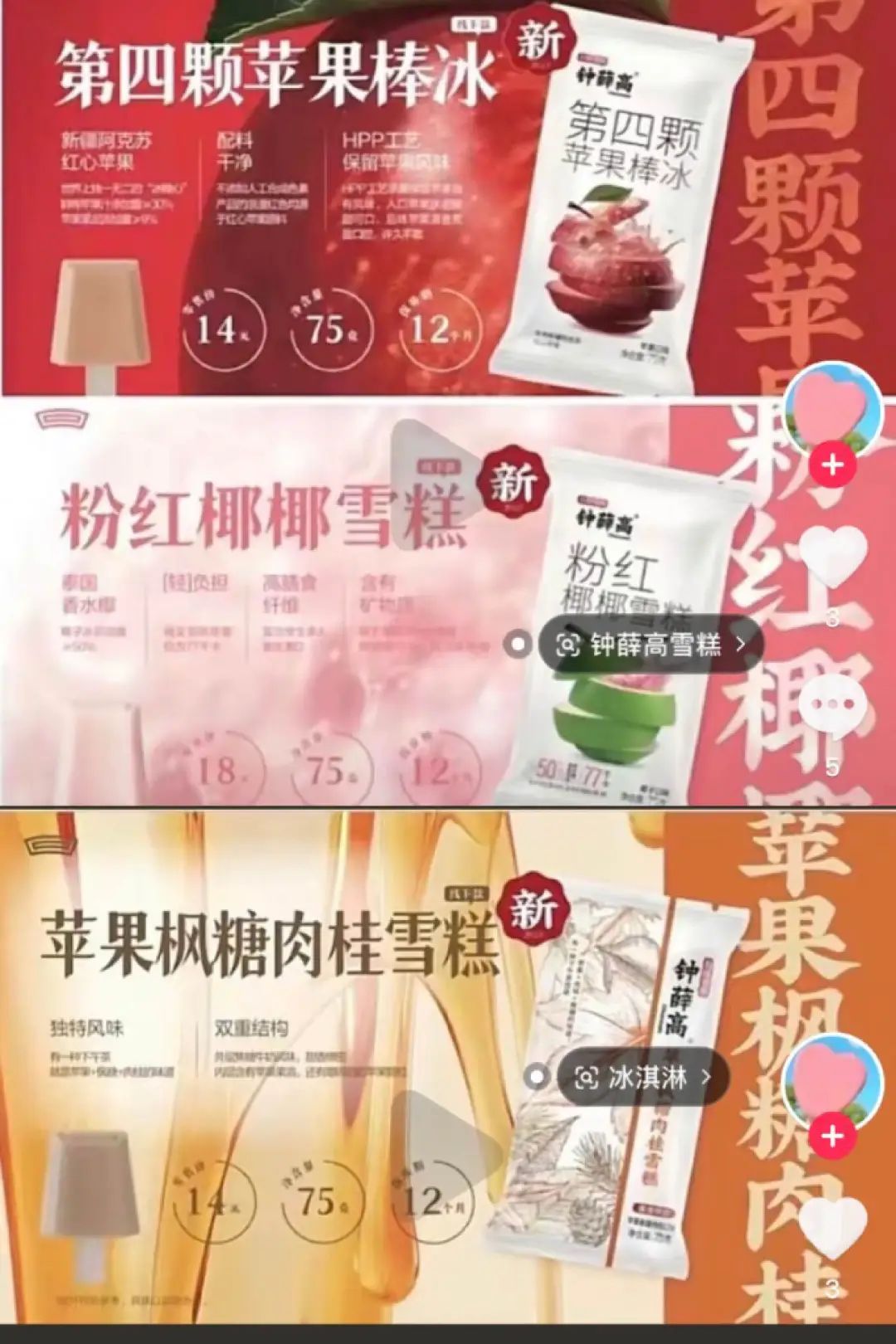 在社交平台上,有经销商流传疑似钟薛高的新品图,钟薛高2024年会推出第四颗苹果棒冰、粉红椰耶、苹果枫糖肉桂新口味。