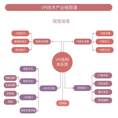 VR技术产业链由虚拟现实技术、应用端两部分组成。虚拟现实技术结构体系包括:视觉呈现端、内容生成端、人机交互端。应用端包括:VR+游戏、社交、购物、影视、教育、旅游、医疗、房产、人工智能等。