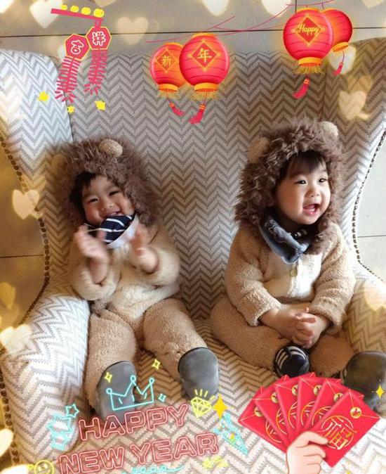 照片中,Jenson和Kyson穿上狮子装,毛帽造型像狮子的鬃毛和耳朵,双双坐在沙发上,眼睛却一个看镜头,一个注意力移向别的地方,兄弟 俩张大嘴巴笑得超开心,灿笑表情完全复刻男神老爸。而林志颖也写下新年祝福:“两只小狮子给大家拜年喽!祝大家新春如意,鸡年行大运。”
