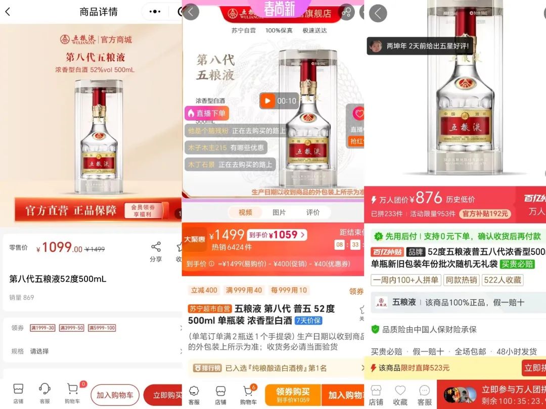 不过,打脸来得也很快。如今,在五粮液官方电商平台,“普五”的售价已经“优惠”到1099元,在五粮液官方合作渠道,“苏宁易购”的天猫官方旗舰店里,“普五”的价格为1059元。在拼多多上,百亿补贴里的“普五”更是仅需876元。