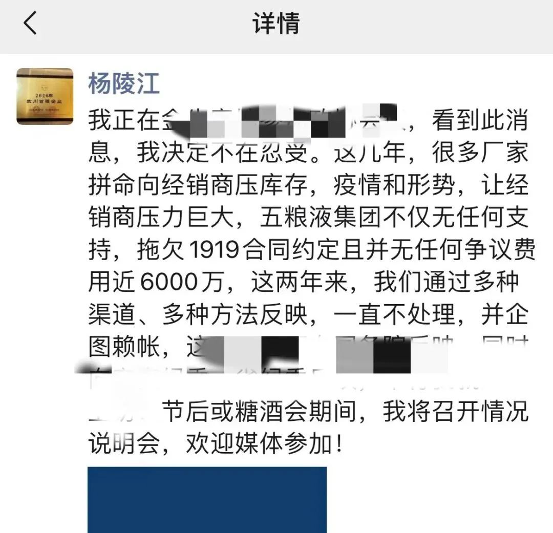 酒类网络零售平台1919董事长、同时也是作为五粮液重要经销商的杨陵江亲自下场,在朋友圈怒斥,称最近几年很多厂家拼命向经销商压库存,让经销商压力巨大。他还提到,“五粮液集团不仅无任何支持,拖欠1919合同约定且并无任何争议费用近6000万”。