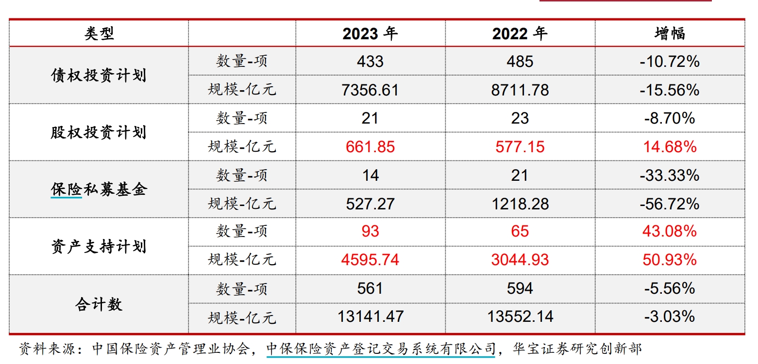 华宝证券3月研报披露,2023年全年,保险资产管理机构登记债权投资计划、股权投资计划和保险私募基金468只,合计注册规模8545.73亿元,较2022年数量和规模分别同比减少11.53%和18.67%。