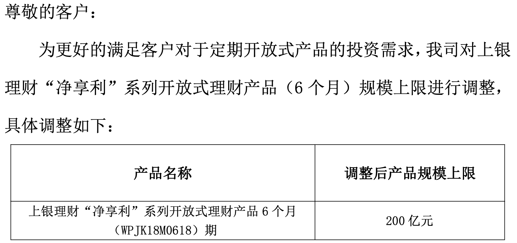 近日,上银理财发布公告将旗下“上银理财净享利系列开放式理财产品(1年) WPJK18M1242期”、“上银理财净享利系列开放式理财产品 6 个月 (WPJK18M0618)期”等多只“净享利”系列理财产品的规模上限上调至百亿以上。