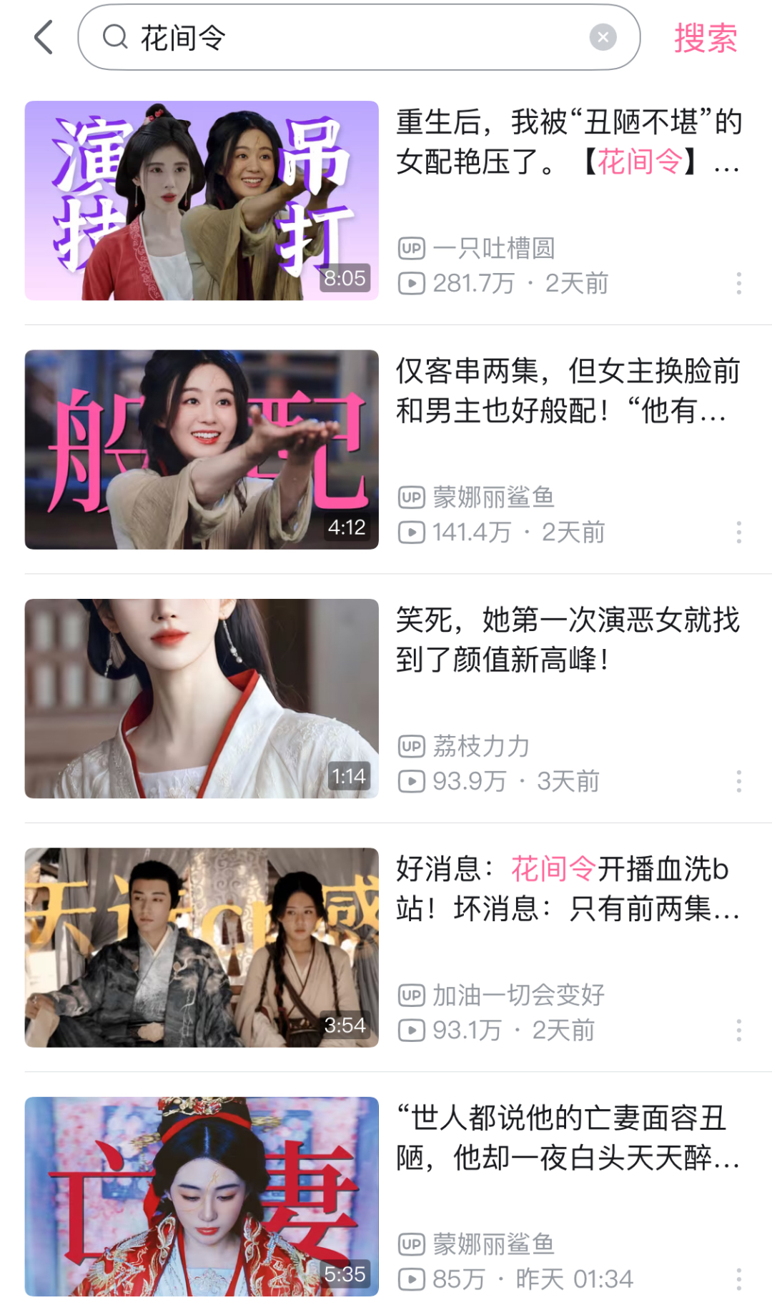 猫眼数据显示,首播当日,《花间令》就在微博和抖音等平台铺开近120个营销话题,CP向的、角色向的、个人向的应有尽有;B站上UP主们也发挥剪辑功力,相关视频播放量动辄百万,很多观众都是从B站中的混剪视频慕名而来。