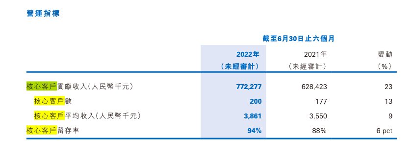 2022年中报显示,核心客户贡献收入7.72亿元,占总营收比例超过80%。同期,核心客户平均收入达到386万元。