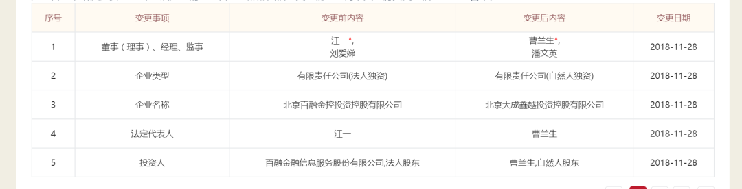 工商信息显示,北京大成鑫越原名北京百融金控投资控股有限公司,于2018年11月28日完成更名,同一天,百融金融信息服务股份有限公司退出北京大成鑫越股东之列。