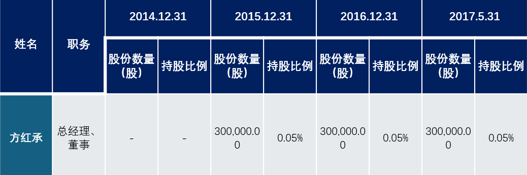 从2017年的披露招股说明书上看,方红承通过员工持股平台——新疆启恒股权投资管理有限公司(现更名为:宁波英融企业管理咨询有限公司)间接持有合盛硅业0.05%股权、30万股。方红承是持股份较多的非(罗立国)亲属高管之一。