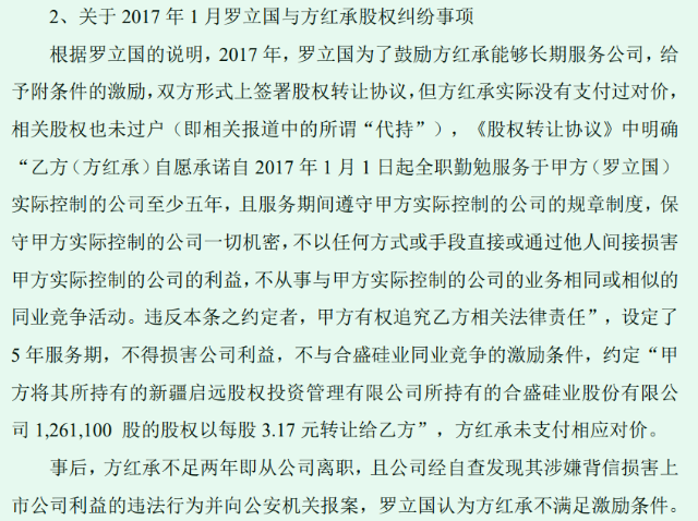 第二,离职高管方红承向合盛硅业讨要他离职前公司授予的激励股份。合盛硅业认为,其违背竞业协议,这部分股份能不能给,存疑。这一项属于劳动纠纷、民事纠纷,最终将会以“金钱”裁定结束。