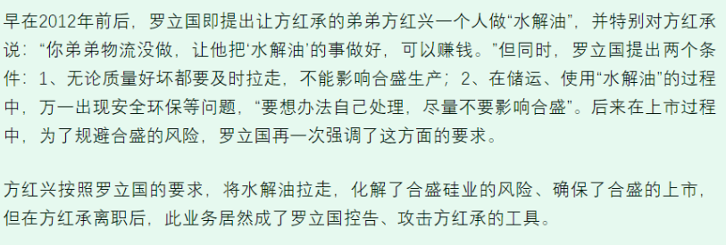 合盛硅业一方这样说:2018年12月,公司内控部对方红承进行高管离任审计时,发现一款名为“水解油”的产品存在长期独家销售的情况,并且相较于公司其他产品而言销售价格畸低。后公司对该产品停止销售并开展调查,发现方红承利用担任合盛公司总经理的职务便利,私自利用公司设备改造生产不在公司许可范围内的产品“水解油”,并伙同其胞弟方红兴垄断“水解油”换取巨额利益,遂于2019年5月13 日报案。