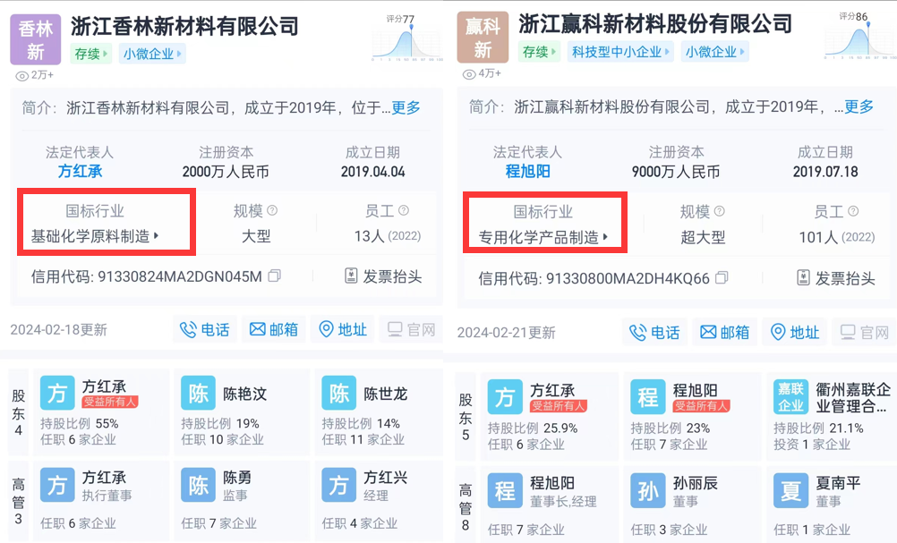 打工未成,方红承只能选择自主创业 。于是在2019年,他成立了浙江香林新材料有限公司(成立于2019年4月)、 浙江赢科新材料股份有限公司(成立于2019年7月) 。方红承自述,前者2019年当年就实现盈利,后者在2022年实现销售收入2亿元,利润1200多万元。