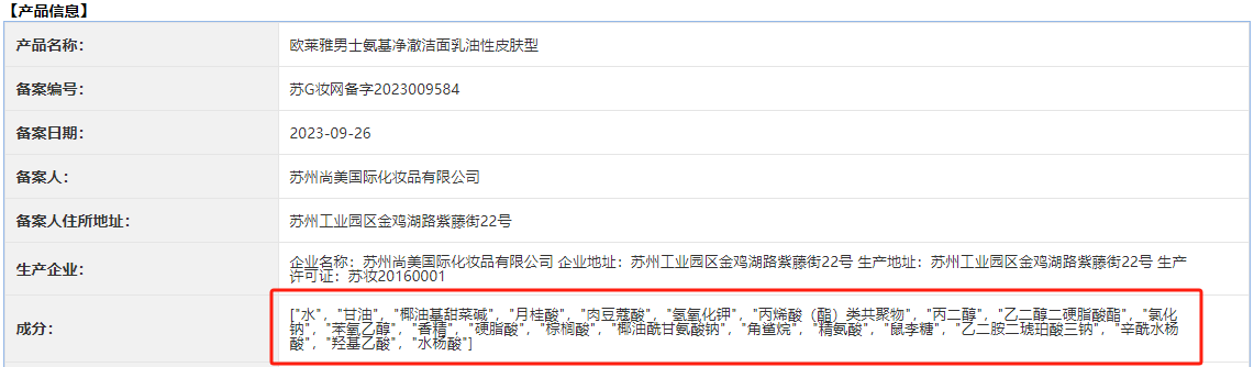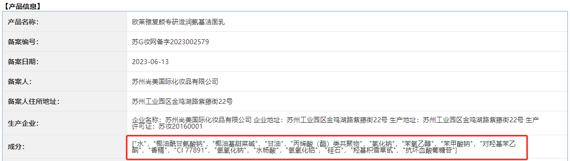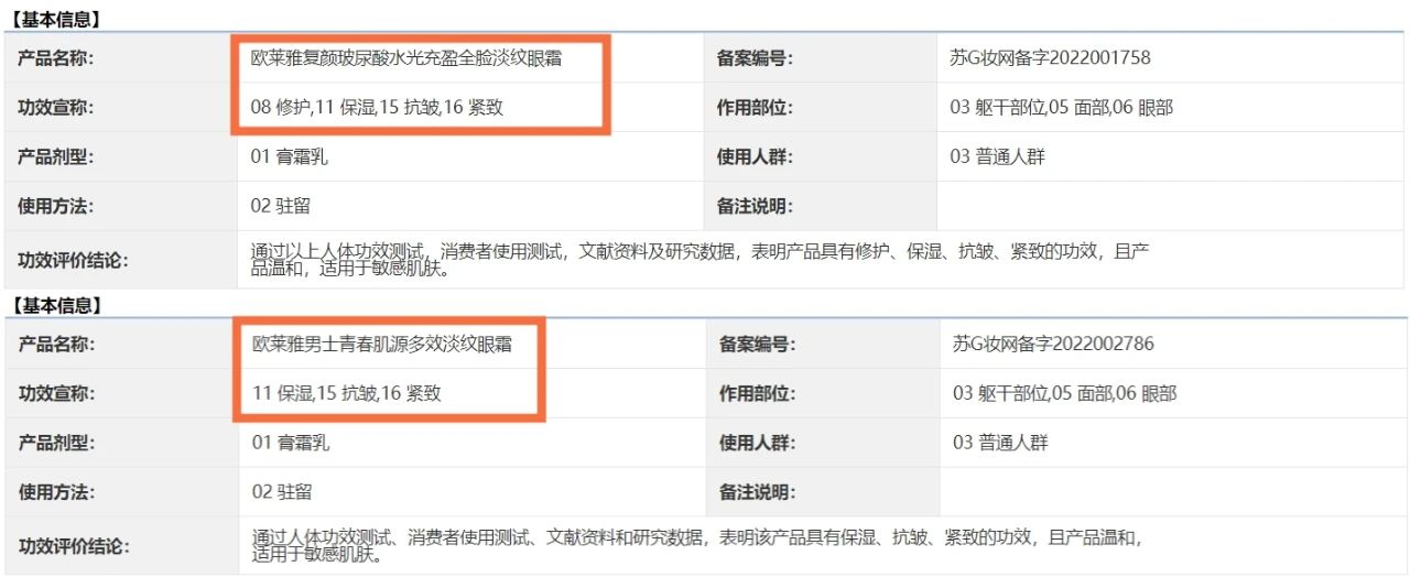 不过,仪美尚通过在国家药监局官网检索发现,上述两款欧莱雅旗下的眼霜产品的备案人同样为苏州尚美国际化妆品有限公司,但其备案成分也不尽相同,且欧莱雅“紫熨斗”眼霜的备案功效比男士“支撑”眼霜多出了“修护”功效。