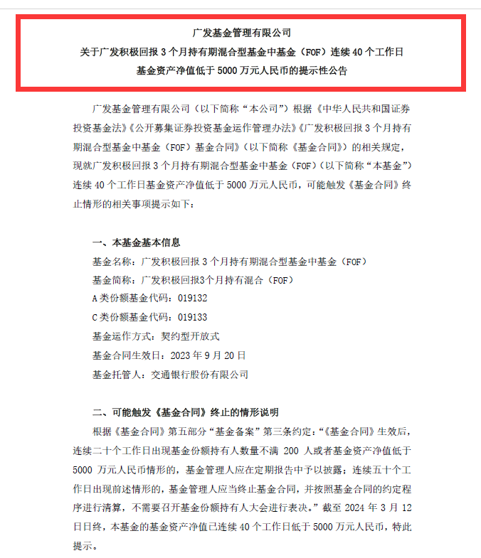 2024年3月14日,广发基金发布公告称,旗下广发积极回报3个月持有(FOF)可能触发《基金合同》终止情形。