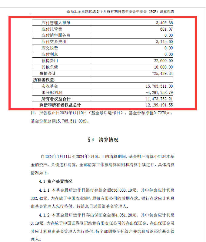 公开资料表明,浙商汇金卓越优选3 个月持有(FOF)成立于2020年5月15日,其募集规模为2.93亿元。截至基金最后运作日的2024年1月10日,基金份额净值0.7278元,基金份额总额1576.55万份,对应基金资产净值仅1147.41万元。