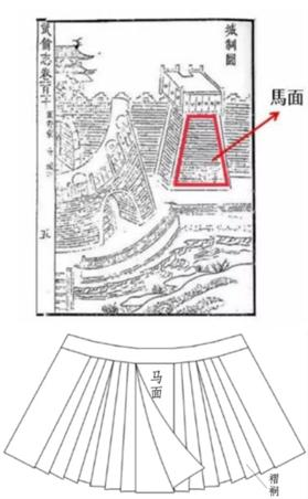 马面裙,又名“马面褶裙”。有考证认为,马面裙的基本形式最早出现在宋代,这一时期的“旋裙”已经具有了马面裙的特征。宋代的女子为了方便骑驴而设计了这种裙式,因其“上窄下宽”形似古代城墙中的“马面”而得名。到了明代,马面裙成为女服中最有特色的服饰之一。