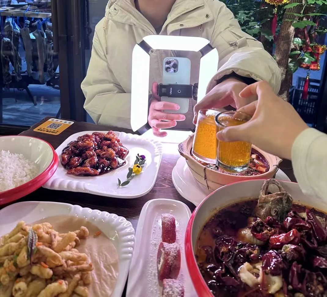 面对强势商家,博主们没有其他选择,坐在了桌边,举起手机开始“幻想”这桌食物的味道。