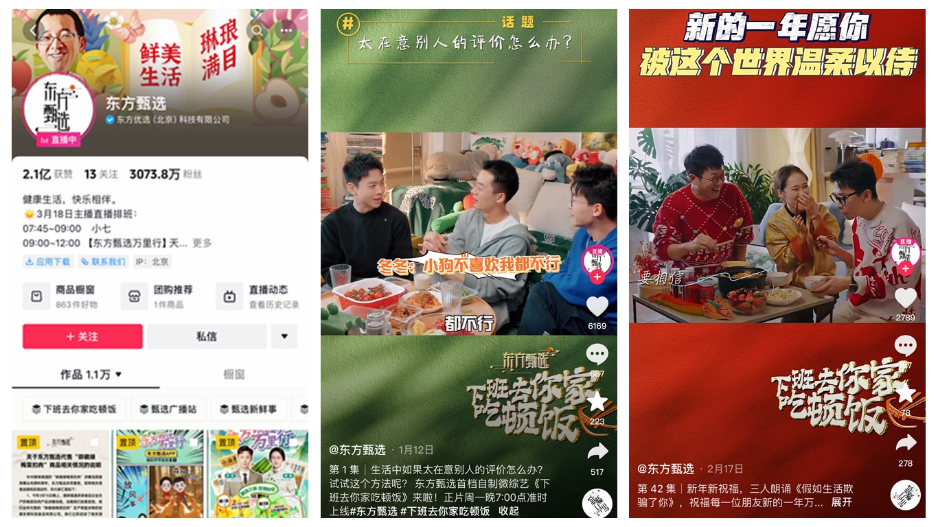国内直播电商行业,现已是一片红海。多平台布局、增强供应链管理之余,东方甄选也在尝试更多可能性。俞敏洪除了经常更新自己的公众号“老俞闲话”,还制作了多档视频节目。2024年1月,东方甄选上线了自制微综艺《下班去你家吃顿饭》,目前累计播放量超过了4112万。