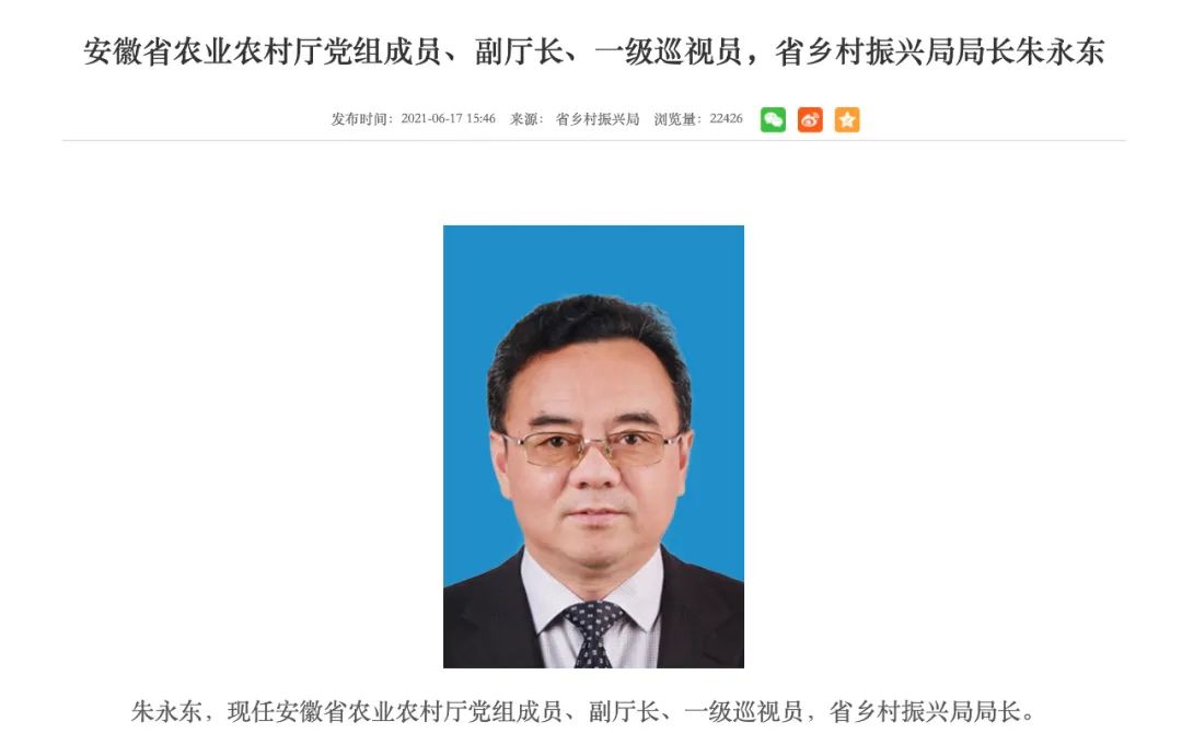日前,安徽省乡村振兴局官网显示,朱永东已任安徽省农业农村厅党组成员、副厅长、一级巡视员,省乡村振兴局局长。