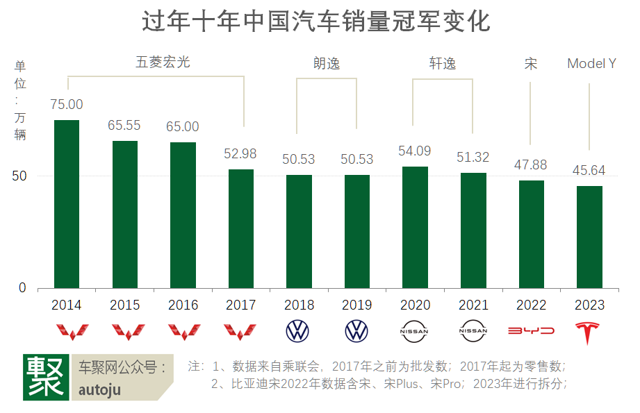 10年销冠涉及5个品牌,其中包括2款中国品牌(五菱和比亚迪)、1款日系(日产)、1款德系(大众)、1款美系(特斯拉),说明各系别轮番登场,中国市场层级丰富、足够包容与开放。