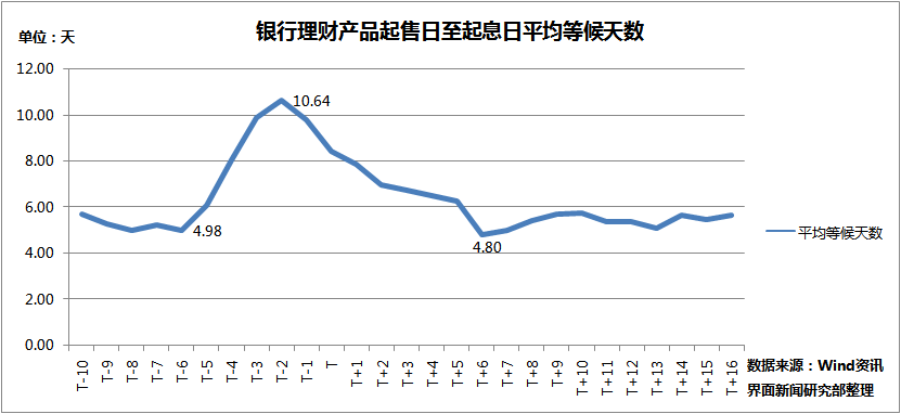 界面新闻以银行理财产品市场2011年至2016年春节期间402家银行发行的16780只人民币理财产品作为样本进行分析。样本选取时间范围为每年春节假日期间(以T到T+6表示)及前后十天的范围(以T-10至T-1以及T+7至T+16表示)。由于某些年度的样本较多,直接求均值容易掩盖一些年度的数据情况,为了使数据尽量反映各年的综合趋势,界面新闻在单日理财产品平均收益的基础上计算了理财产品加权平均收益,用红线表示。