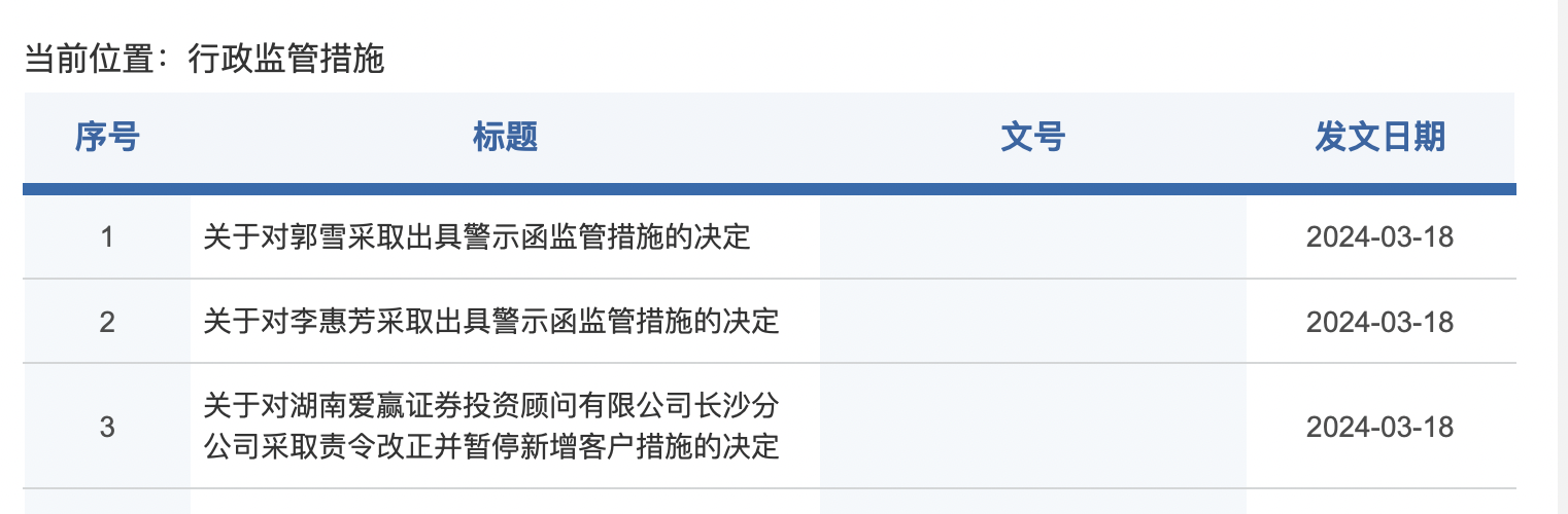 2月29日,因公司治理、员工无证展业、误导性营销宣传、网络直播管理不规范等多项问题,湖南证监局对爱赢投顾总公司采取责令改正的行政监管措施。监管表示,将在日常监管中持续关注爱赢投顾的整改情况。