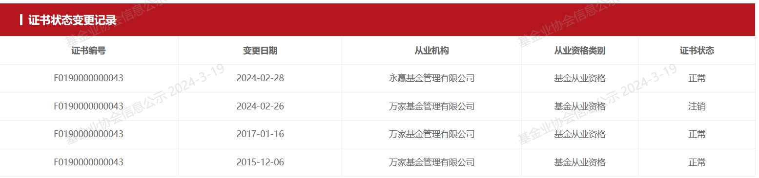 又有知名基金经理的去向”浮出水面“。日前,中国证券基金业协会的从业人员信息显示,李文宾的从业机构已经在2月26日变更到永赢基金。2月26日,老东家万家基金刚刚注销了他的从业资格证书。
