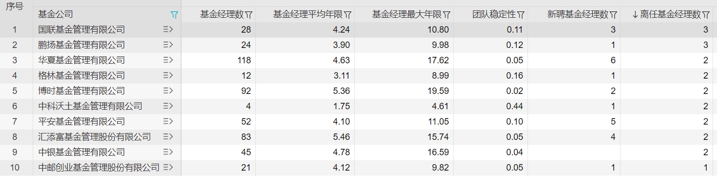 从基金经理新聘和离任的数量来看,鹏扬基金、中银基金实现”净流出“。其中,鹏扬基金有3位基金经理离任,仅新聘了1位基金经理;中银基金离任了2位,没有新聘基金经理。而华夏基金、平安基金、汇添富基金则实现”净流入“,新聘基金经理数量大于离任数量。