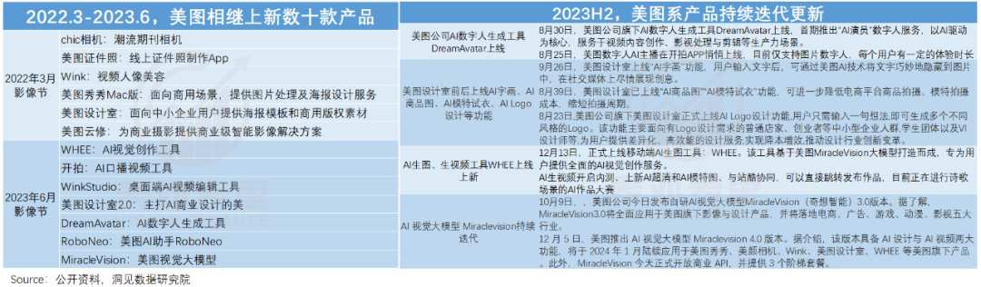 可以看到,2023下半年,美图在已经形成的生产力、消费两大产品矩阵上,把视觉大模型再度进化至4.0版本,且多款产品持续更新迭代。