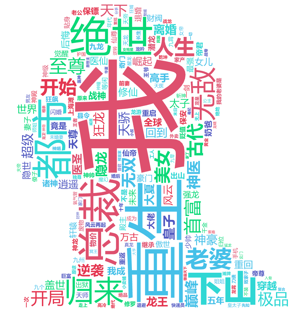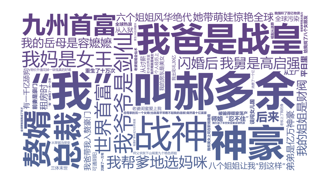 “我”(129部提及,下同)叫郝多余(6)、我爷爷是剑仙(15)、我爸是战皇(17)、赘婿(39)、神豪(49)、九州首富(25),我帮爹地选妈咪(9)。我妈是女王(29)、战神(18)、总裁(53)、世界首富(56)。