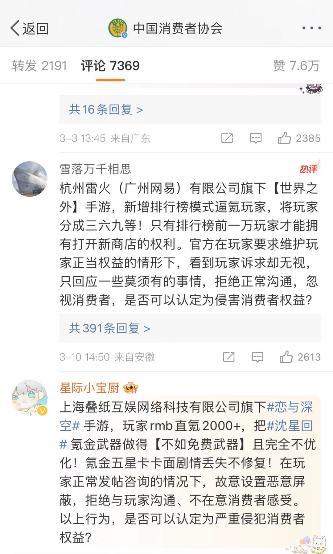 在刚刚过去的315官方维权微博评论区里,惊现一批国乙维权玩家。玩家们在这一日,相约着前来“举报”叠纸与网易的新乙游《恋与深空》《世界之外》,诉其虚假宣传侵害消费者权益。前者将氪重金的武器做得不如免费武器、不在意消费者感受;后者在游戏中设置排行榜和专属商店将玩家分为三六九等,诱导玩家消费氪金。