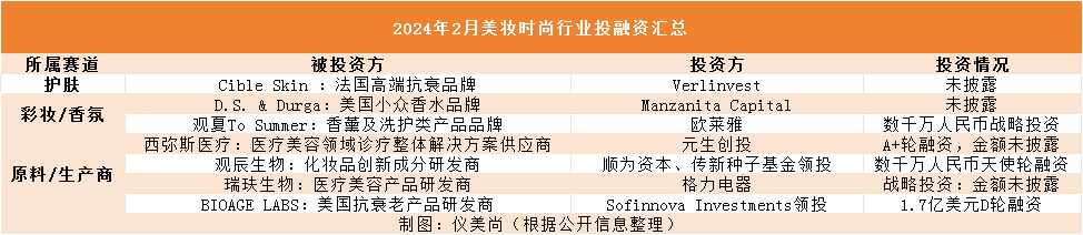 在整个护肤及彩妆香氛赛道,2月的投融资节奏相较于今年1月,显得较为沉寂,包括上游企业在内,共计发生7起投融资事件,较1月的17起减少了59%;2月已披露的投融资总金额约12亿元,仅占月度投融资总金额的6%。