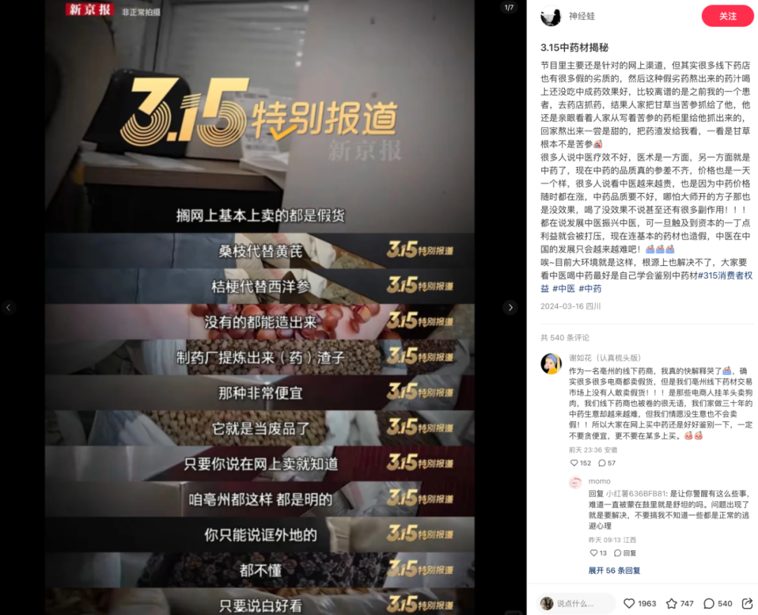 315刚曝光完,不法分子用外形相似的药材冒充、废药渣二次加工、还有染色和硫磺熏蒸等各种科技狠活。