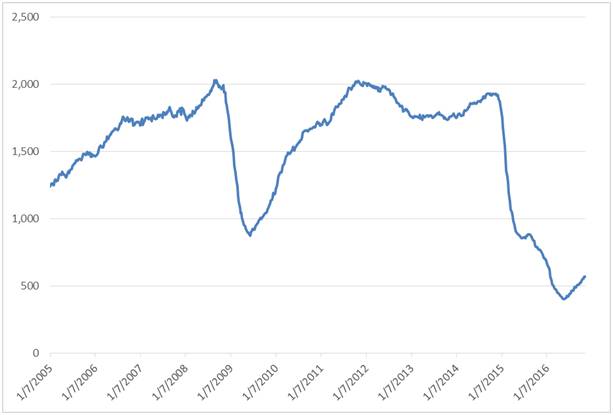 从2005~2014这十年,世界三大油服公司的年营收节节攀升。尤其是在2010年后,更是大幅上涨,这和北美页岩油的开采作业量有很大关系。页岩油商疯狂开采,打井打红了眼,北美活跃油气钻机数一天比一天高。石油会过剩一事,早已被人遗忘。在巨大的利益诱惑面前,风险是不容易被人注意的。