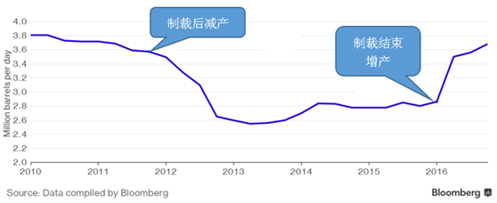 第二,伊朗石油产量大降。因为核问题受到制裁,从2011年起伊朗石油产量就开始迅速下降。从彭博提供的数据看,从2011到2014年,伊朗石油产量降幅高达30%,又为石油供应的过剩埋下了一颗地雷。