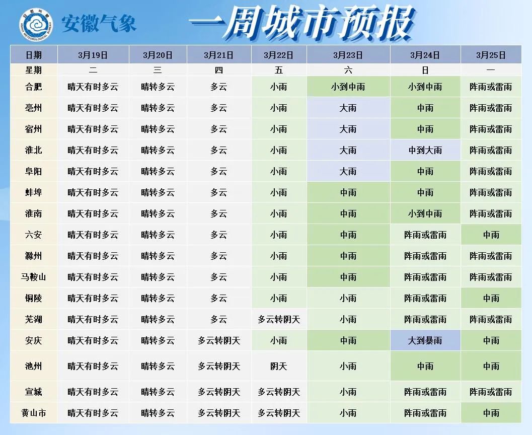 降水:未来三天全省以晴到多云天气为主。22-25日我省多阴雨。23日沿江江北有中雨,其中淮北地区和大别山区有大雨,江南有小雨,部分地区中雨;24日江北有小到中等阵雨或雷雨,其中淮北地区和大别山区有大雨,部分地区暴雨,江南有阵雨或雷雨。