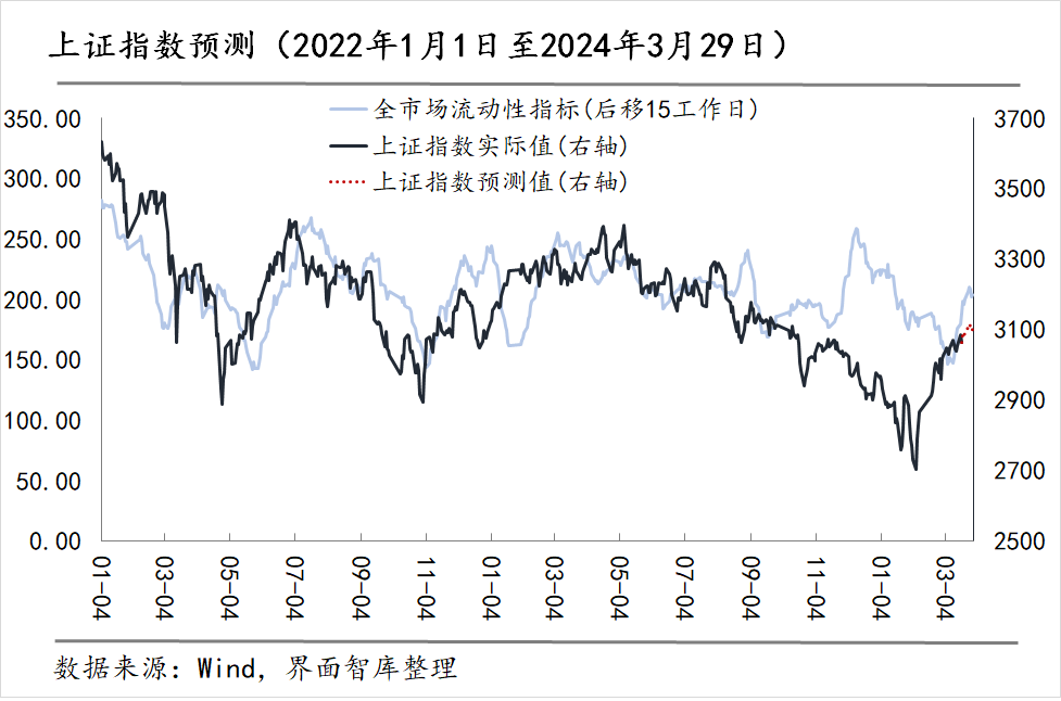 对于3月下半月(3月20日至3月29日)的走势,我们以重置后全市场流动性指数后移15个交易日作为上证指数变动预测的依据,可以看到后移的流动性指数与上证指数的吻合度相对较高。