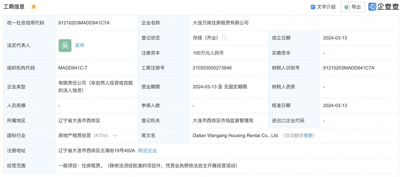 据企查查信息显示,万岗住房租赁成立于2024-03-13,法定代表人为吴华,注册资本为100万元人民币,所属行业为房地产业,主要经营范围为住房租赁。股东信息显示,该公司由大连万达商业管理集团股份有限公司(以下简称“万达商管”)全资持股。