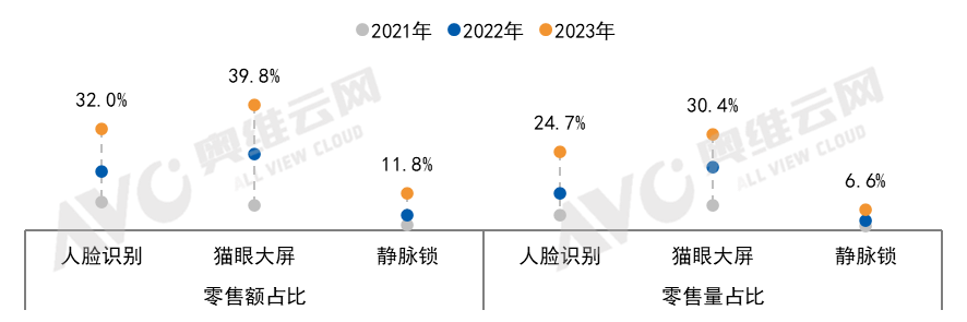 人脸识别:零售额占比为32.0%,较2022年增长13.2个百分点;零售量占比为24.7%,较2022年增长13.0个百分点。