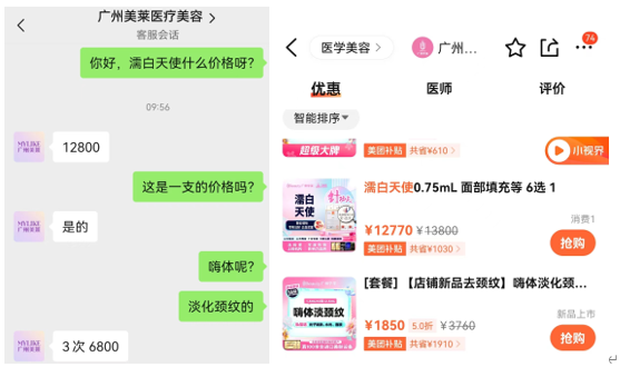 界面新闻查询大众点评APP发现,广州华美医疗美容医院濡白天使0.75ml在美团补贴1,030元后,报价12,770元。嗨体在打五折后,报价为1,850元。