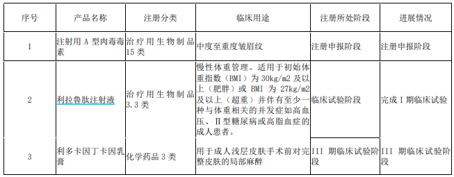 - 用于改善眉间纹的注射用A型肉毒毒素处于注册申报阶段;